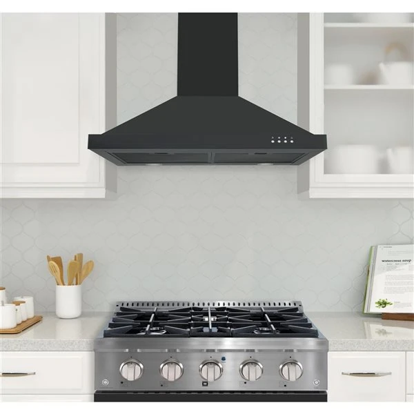 - 30-inch wall mount pyramid range hood in black stainless steel