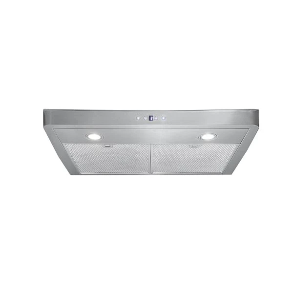 This 30 inches discreet and efficient stainless steel under cabinet range hood offers high performance ventilation with its powerful 600 CFM internal blower motor. The soft touch electronic controls activate the 3-speed fan and LED lighting. The unit also includes 2 types of filters, stainless steel baffle or reinforced micro mesh to efficiently remove grease and heated vapours from the air. Designed for a standard ducted vertical exterior installation, the under cabinet range hood integrates 6 inches circular exhaust duct connection.
