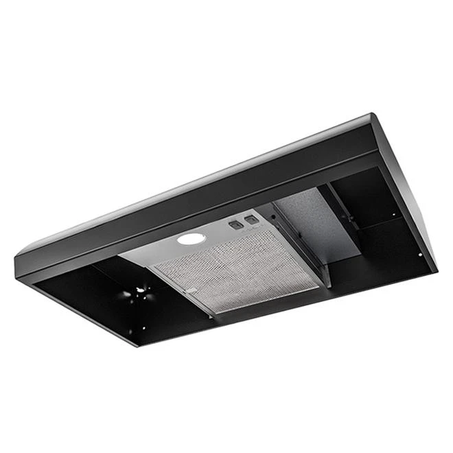 The slightly rounded design and sleek black finish of the Broan BXT1 Series range hood enhances the contemporary touch of your kitchen. Hidden switches provide a clean, highly aesthetic finish and are easy to use. The large, dishwasher-safe filter, fully integrated lighting panel and upward-facing recirculation grille ensure easy maintenance. The hood has a maximum fan power of 270 CFM and provides single level lighting with powerful LED lights. Its sounds volume registers at 7 sones. The four-way convertibility makes it easy to fit the hood into your kitchen setup. Black model.