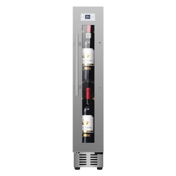 Transform the smallest of spaces into your very own sophisticated wine nook with the Equator super-slim 9-bottle wine refrigerator. Only 0.78-cu ft and measuring 32.28-in x 5.90-in x 20.66-in (H x W x D), harnessing the power of compressor fan cooling is right at your fingertips with sleek touchpad controls and a bright LED display. Your collection is always protected with a series of alarms to alert you of temperature fluctuations or when the door is left open. Plus, the anti UV glass blocks harmful rays from penetrating your prized collection. Expertly engineered with adjustable feet and a reversible door, this compact gem can be freestanding or placed under counters.