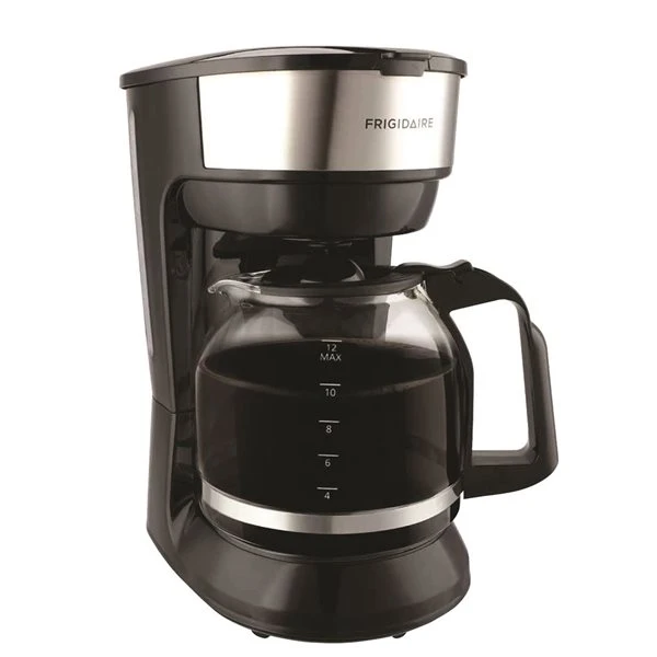 Brew a large pot of morning coffee using this Frigidaire coffee maker. You can make 12 cups at a time to keep the coffee lovers in your household satisfied. The glass carafe has a heatproof handle and is dishwasher safe. Rest easy as the unit has boil dry protection.