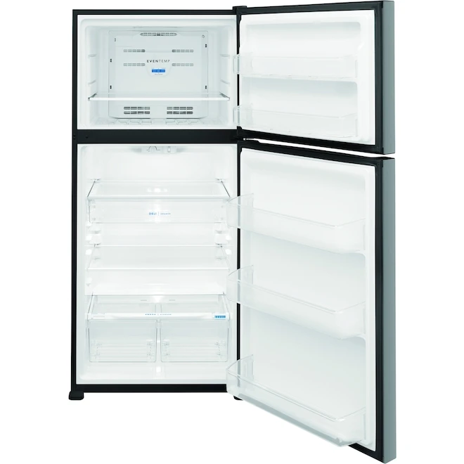 This Frigidaire 20 cubic foot top freezer refrigerator fits in the same sized cutout as a traditional 18 cu ft model (30-in width x 66-in height cutouts). This refrigerator features the EvenTemp cooling system, precise temperature control which keeps food at one ideal temperature. Spacious interior storage options include a full-width deli drawer, generous door bins, and a full-width glass freezer shelf. This model is similar to FFTR2045VS but features EasyCare Stainless Steel with an easy-to-clean fingerprint-resistant finish.