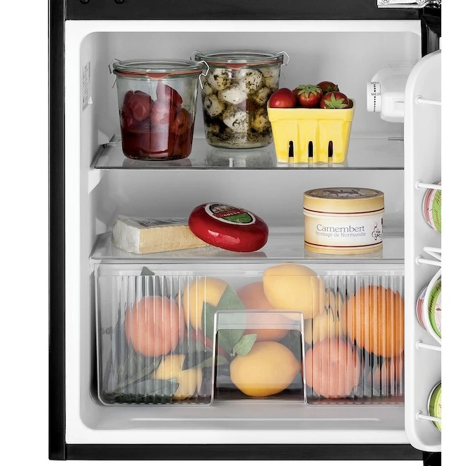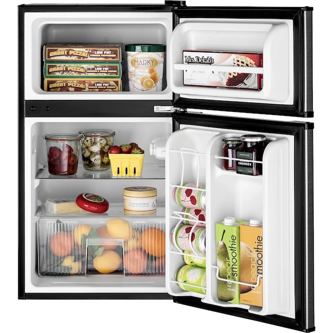 GE 3.1 cu. ft. dual-door compact refrigerator features 2 different compartments to hold multiple frozen and fresh grocery items. Easy-to-clean glass shelves, clear crisper drawer for fruits and vegetables, door bins and can rack for your favourite drinks optimize food storage possibilities . Rounded doors with recessed handles leave a beautiful smooth look, and make opening and closing simple.