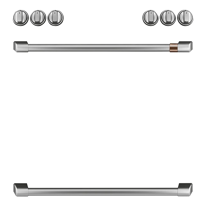 Customized your gas range with this set of elegant and sleek brushed stainless control knobs and handles exclusively crafted for GE Café® range models; CCGS700P3MD1, CCGS750P4MW2 and CC2S900P3MD1. This product is backed by a 1-year limited warranty.