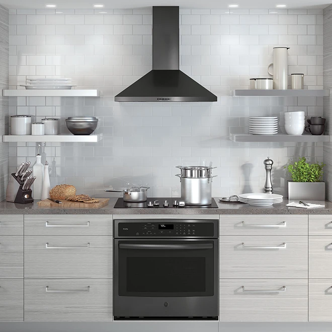 Freshen up your dwelling’s atmosphere with this GE 30-in W range hood. The sleek, black finish of this chimney-style vent enhances a contemporary-style kitchen. It removes odours, smoke and moisture with a powerful 350 CFM airflow. Choose among four blower speeds with the back lit electronic controls. The removable grease filters are dishwasher-safe to simplify cleanup. Corrosion resistance makes this stainless steel range hood easy to maintain. Two halogen lights illuminate the stovetop and surrounding area during meal preparation. A night light keeps the kitchen dimly lit. Use it as a recirculating or external venting appliance to go with your kitchen’s layout. This wall-mount range hood measures 9 3/4 in H x 18 1/2 D in. It comes with a 1-year warranty for parts and labour.