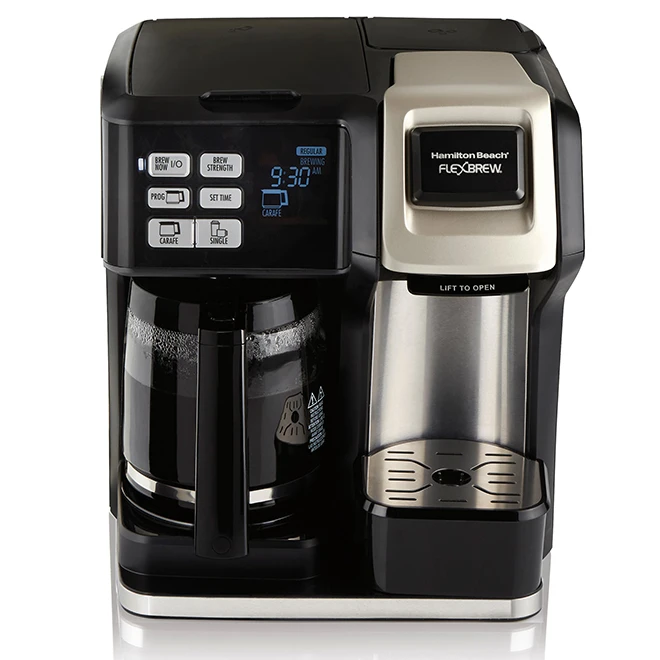This FlexBrew(R) multifunction coffee maker by Hamilton Beach(R) offers two brewing options. You can use the single serve option with a K-Cup(R) pack (296 ml) or using ground coffee (414 ml), and select regular or bold brew strength. In addition, the single-serve pack holder and reusable brew basket are included, making this coffee machine an ecofriendly choice. You can also brew coffee using the 12-cup carafe side, while still selecting between the two brew strengths. For added versatility, a programmable timer with automatic shutoff after two hours, as well as a function that lets you grab a cup of coffee before the end of the cycle are offered. This product comes with a reusable filter and is backed by a 5-year limited warranty.