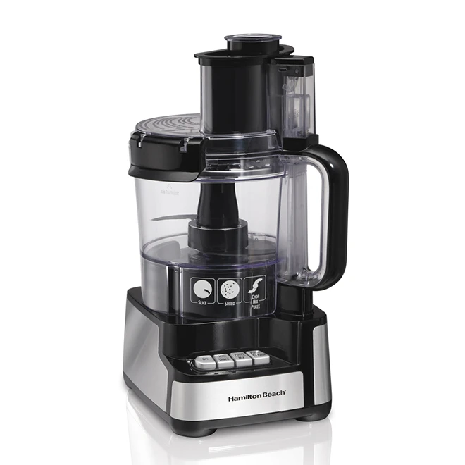 Food prep is easy with this Hamilton Beach Stack & Snap(R) food processor. The 450-watt motor delivers the power you need to chop, slice, shred, mix and purée with ease. The function guide shows you which blade to use and which button to press for hassle-free use. The stack and snap design eliminates twisting, turning or locking to assemble the food processor. A large-mouth feed takes the work out of precutting, and the 12-cup bowl is sealed to prevent leaks so you can process liquids without mess. The food processor includes a reversible slice and shred disk, a chopping S-blade, bowl and lid that are dishwasher safe for quick and easy cleanup. With its black finish and cord storage, the food processor looks great and sits neatly on your countertop or in your cupboard.