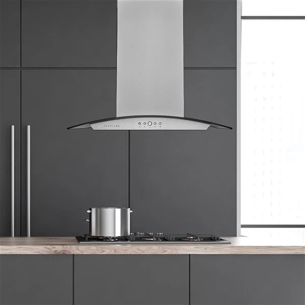 - Elegant glass canopy-style range hood with stainless steel chimney