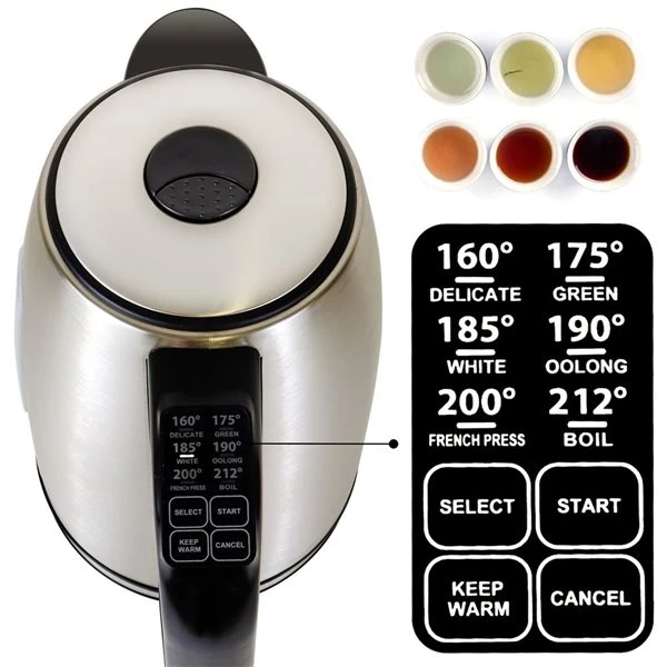 - 6 programmed temperature settings – Delicate Tea (160°F), Green Tea (175°F), White Tea (185°F), Oolong (190°), French Press (200°F), and Boil (212°F)