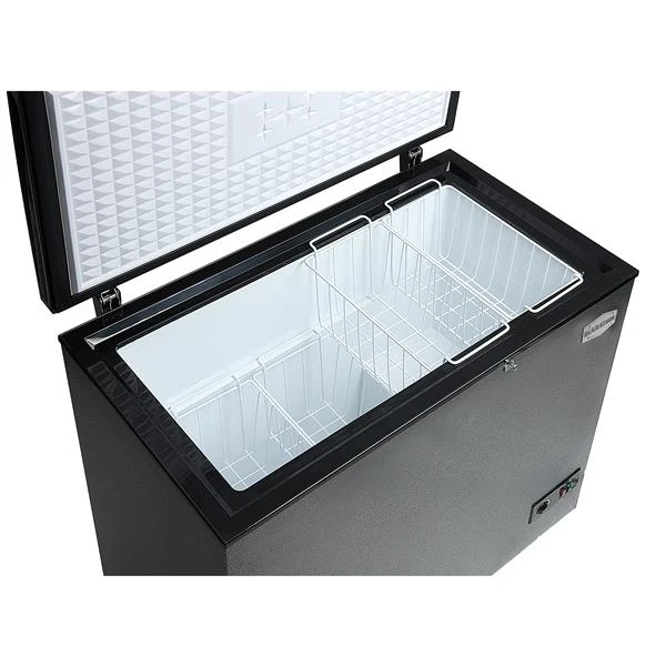 Organize your frozen foods with this chest freezer by Marathon®. This product offers a stylish design and spacious interior. It features an innovative two-tiered basket system and a granite finish. This freezer comes with an aluminum liner, a defrost drain, four storage baskets, a light, safety locks and four wheels. EnergyStar certified. Two-year limited warranty.