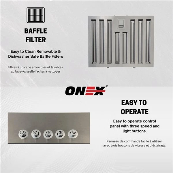 - DISHWASHER SAFE aluminum mesh filter: ONEX® range hood comes with aluminum mesh filter that are easy to pop out and can be places in the dishwasher for easy cleaning