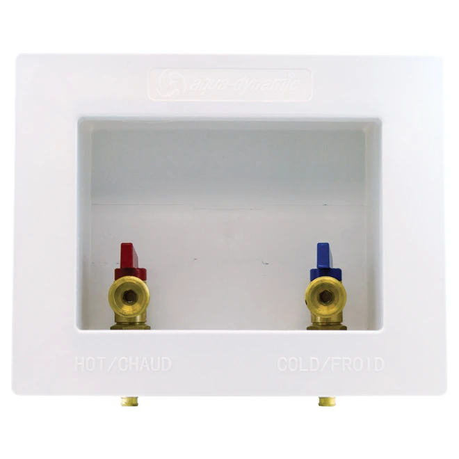Washing machine outlet box, with hot & cold 1/4 turn PEX valves, extended mounting flange. Snap-on frame accommodates up to 3/4″ drywall. Prevents supply lines from crossing P-trap, dual drain washer box.