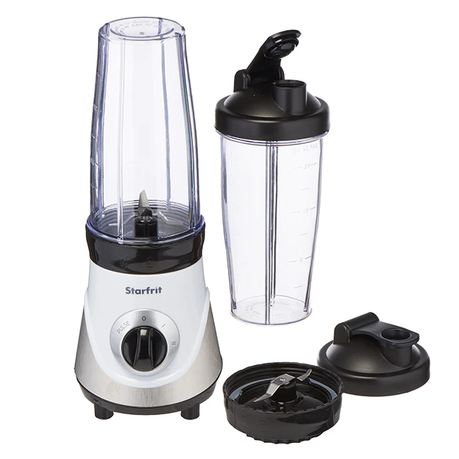 and with its handy lids, great for on-the-go breakfast preparations! Includes two specially-designed stainless steel blades; the cross blade is for blending, while the flat blade is for grinding. The blending blade crushes ice into snow in seconds – ideal for frozen drinks and smoothies. The grinding blade is perfect to grind coffee beans, nuts and spices. You can choose between three speeds – High, Low and Pulse control. Includes two large cups of 28 oz (828 ml) and two “To-Go” lids – great for individual use or for families. Thanks to its security feature, the blender will not operate unless the blade lid is securely tightened on cup. Its non-stick suction feet prevents the blender from moving while it is in use. Easy storage because of its small and convenient size. All parts are dishwasher safe and BPA free. It is equipped with a powerful 300-W motor and is cUL and ULu certified (Canada and USA). Backed by a 1-year limited warranty.