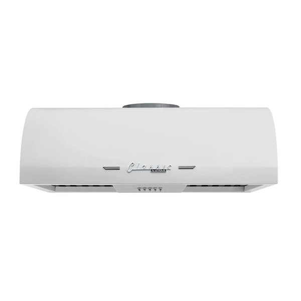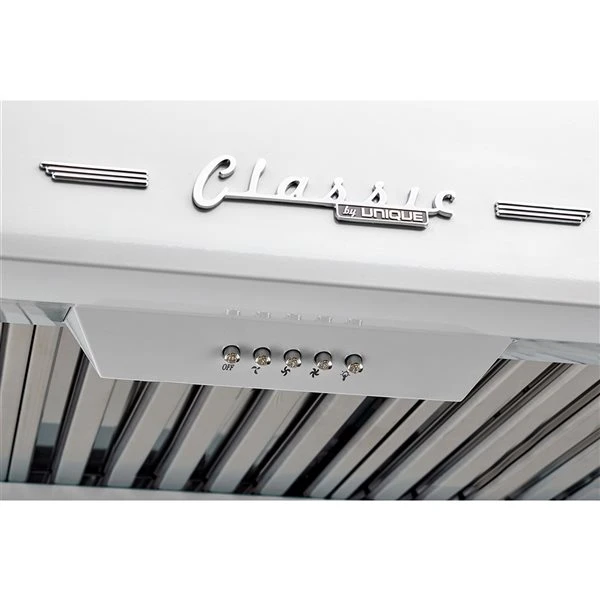 This Classic Retro range hood by Unique transports you back to the 1950s with its iconic retro design and chrome-finished accents. Two powerful motors provide varied ventilation based on your needs. It features simple effortless controls, 2 LED lights and a stylish design.
