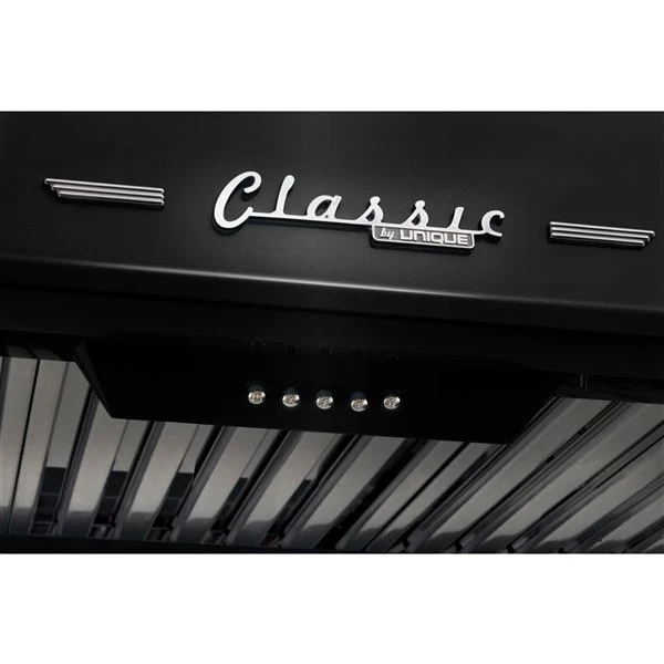 This Classic Retro range hood by Unique transports you back to the 1950s with its iconic retro design and chrome-finished accents. Two powerful motors provide varied ventilation based on your needs. It features simple effortless controls, 2 LED lights and a stylish design.