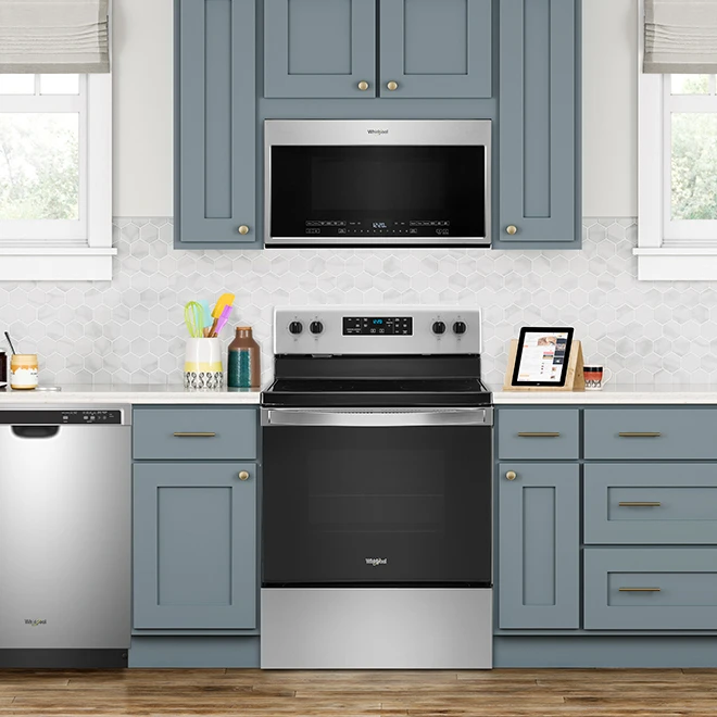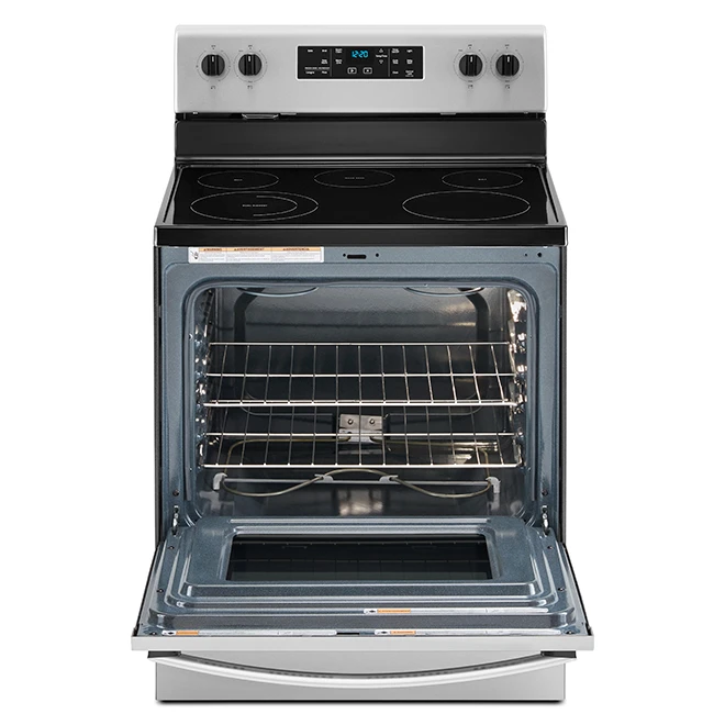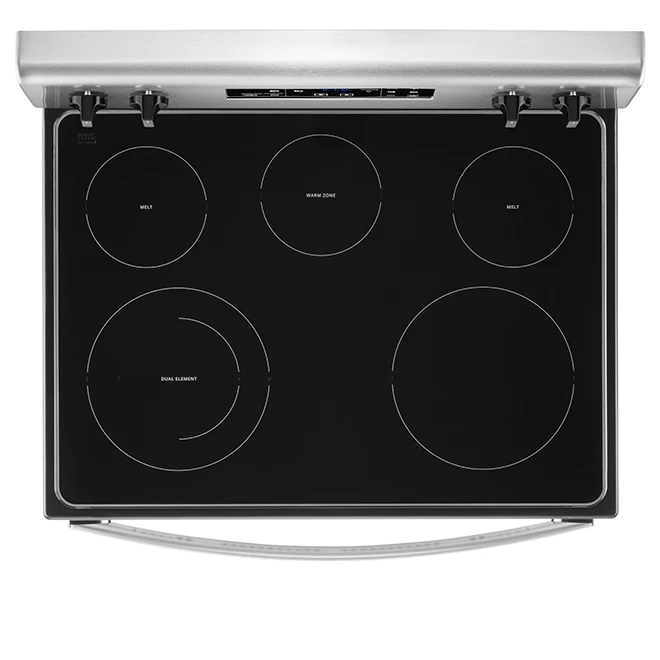 Handle your family’s cooking needs with this Whirlpool 5.3 cu. ft. self-cleaning range with Frozen Bake technology. It has a stainless steel finish to add dazzle to your kitchen setup. Its ceramic glass cooktop has raised edges to contain spilled liquids. This self-cleaning 5.3 cu. ft. range with frozen bake technology reheats frozen pizza and chicken nuggets quickly. It has a keep-warm function to keep your cooked food hot. A Flex Heat dual-ring element and four other electric burners let you cook various recipes. This 30-in wide range has a 2400 W single oven for baking your pastries. A 3400 W broiler prepares your meats quickly. The appliance has a storage drawer for your baking tools and kitchen accessories. Electronic touch controls and rotary knobs let you operate this appliance easily. With a self-clean function, this oven eliminates grease and cooking debris. It comes with a 1-year limited warranty.